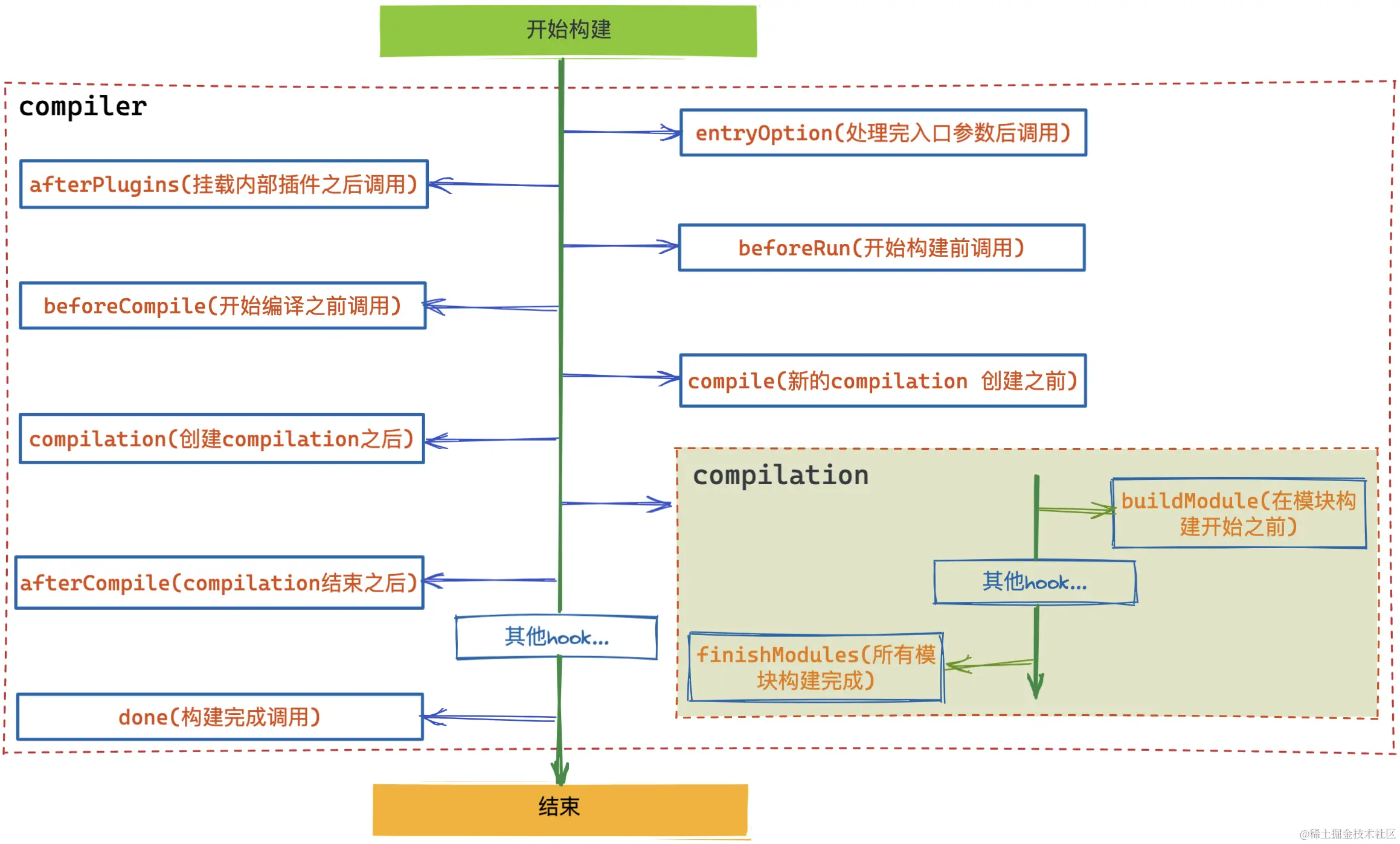 - 类比到 Vue 和 React 框架中的生命周期函数,它们就是到了固定的时间节点就执行对应的生命周期,tapable 做的事情就和这个差不多,可以先注册一系列的生命周期函数,然后在合适的时间点执行